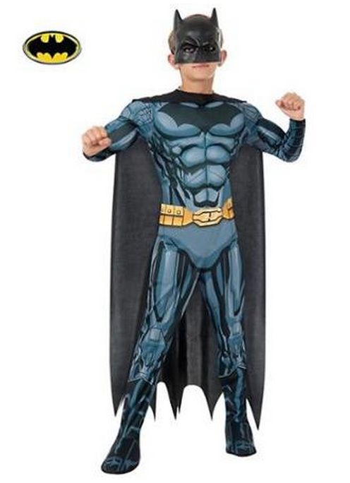 Детский костюм Бэтмена состоит из комбинезона с принтом и накладными нагрудными мышцами, маски на глаза, ремня и черного длинного плаща-накидки.