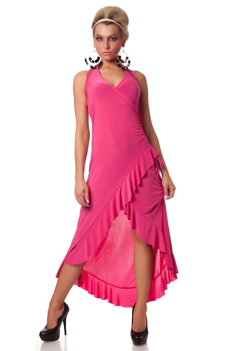 Длинное розовое платье сальса - это элегантное платье, которое вы можете надеть на вечер танцев и другие мероприятия. Платье с декоративным запахом и завязочками сбоку, неровный подол выполнен из множества сборочек. У платья имеется одна завязывающаяся бретелька через шею. Сзади подол опущен ниже, чем спереди.