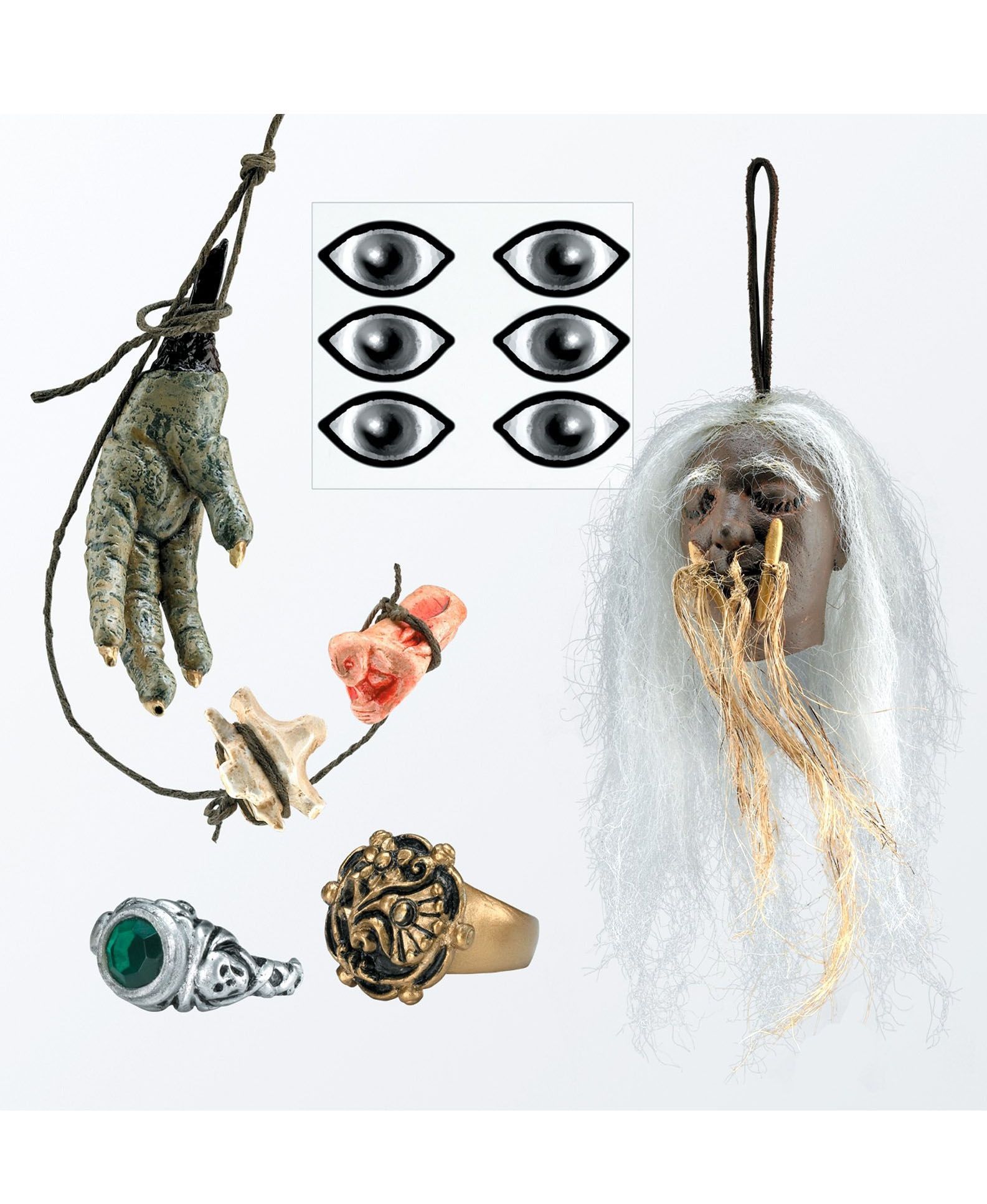 3. отрубленную голову и руку с костью и носом на верёвочке