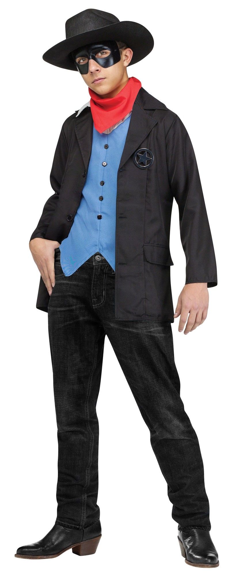 Детский костюм Мстителя Дикого Запада включает в себя черный удлиненный пиджак, голубую манишку с черными пуговицами, красный шейный платок, маску на глаза черного цвета, а также черную шляпа в ковбойском стиле. Пистолет и прочие аксессуары для дополнения образа вы можете приобрести на нашем сайте.