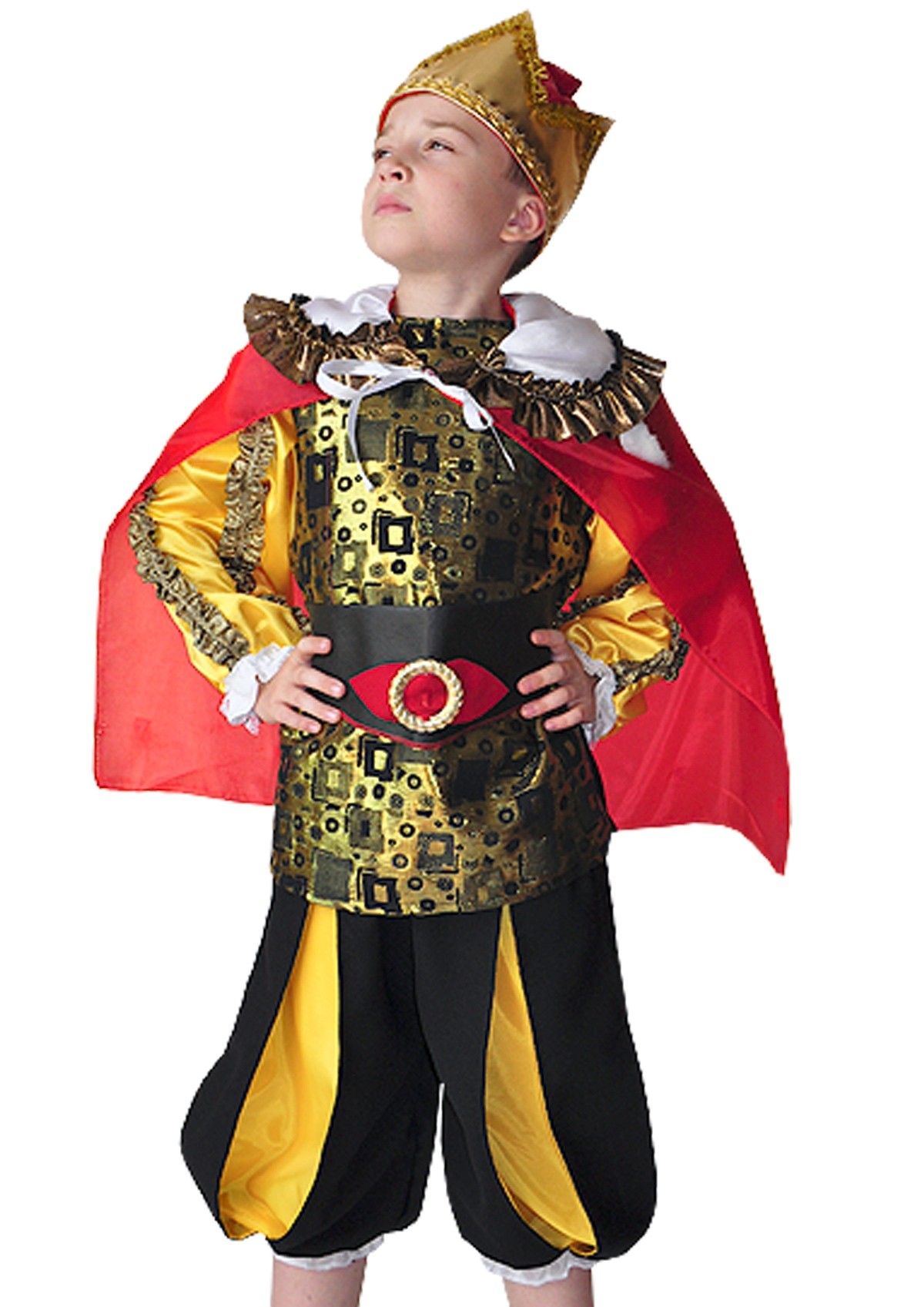 Детский костюм важного короля - черно-золотой костюм с красными элементами. В комплект входит золотистая корона из мягкого материала, блуза с длинными рукавами и кружевными манжетами, широкие черные штаны с золотистыми вставками, широкий черный пояс и красный плащ с объемным воротником.