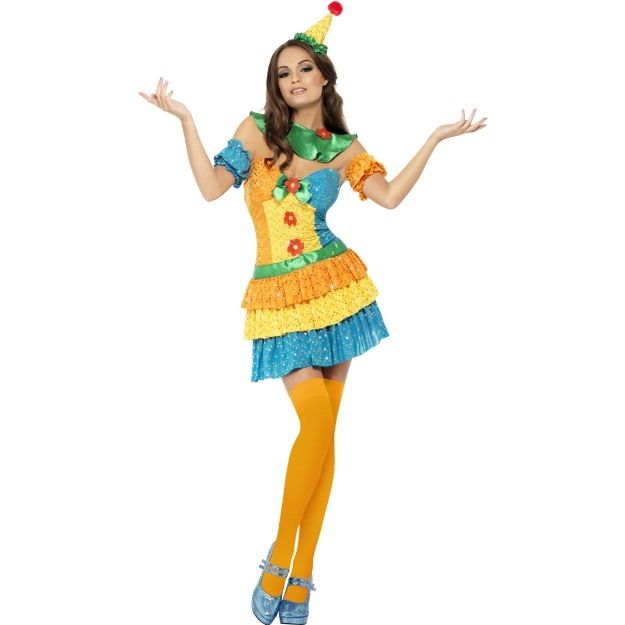 Яркий костюм милашки клоунессы включает в себя яркое разноцветное платье с юбочкой с рюшами и помпонами на топе. К платью прилагается зеленый атласный воротник, нарукавники с рюшами и мини-колпак желтого цвета.