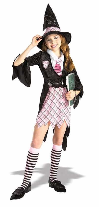 Костюм ведьмочки Charm School - это яркий черно-розовый костюм, в который входит удлиненная курточка, черные накладки на обувь с длинными носами. Также костюм дополняет высокая конусная шляпа, клетчатая юбка, белая манишка с галстуком и длинные полосатые гольфы.