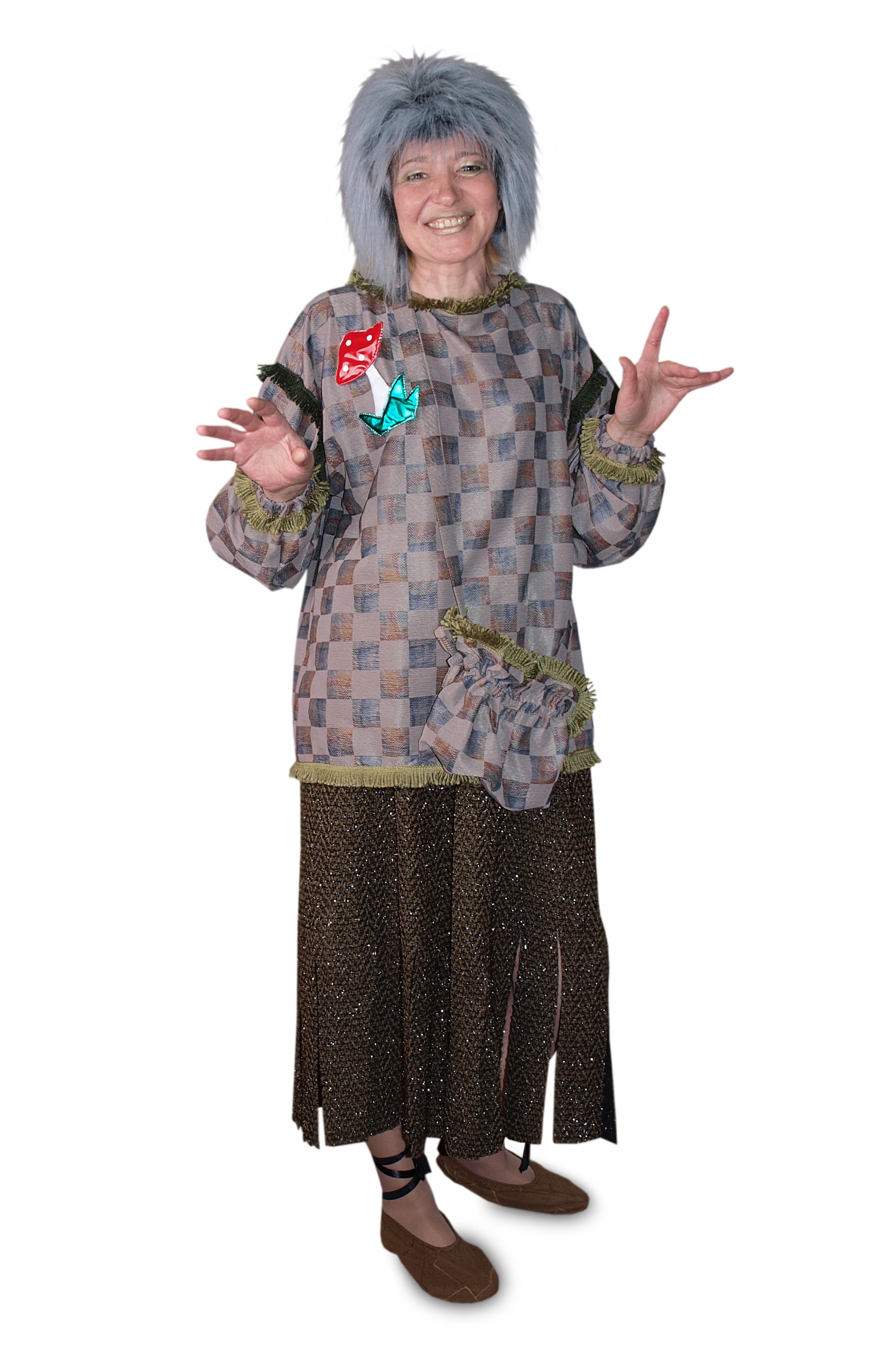 Костюм Кикиморы для взрослых представляет собой образ мифического известного персонажа, который подойдет для постановки спектаклей и других подобных мероприятий. В комплект костюма входит длинная коричневая юбка, клетчатая свободная кофта, сумка в тон кофте, лапти, а также серый парик из искусственных волокон.