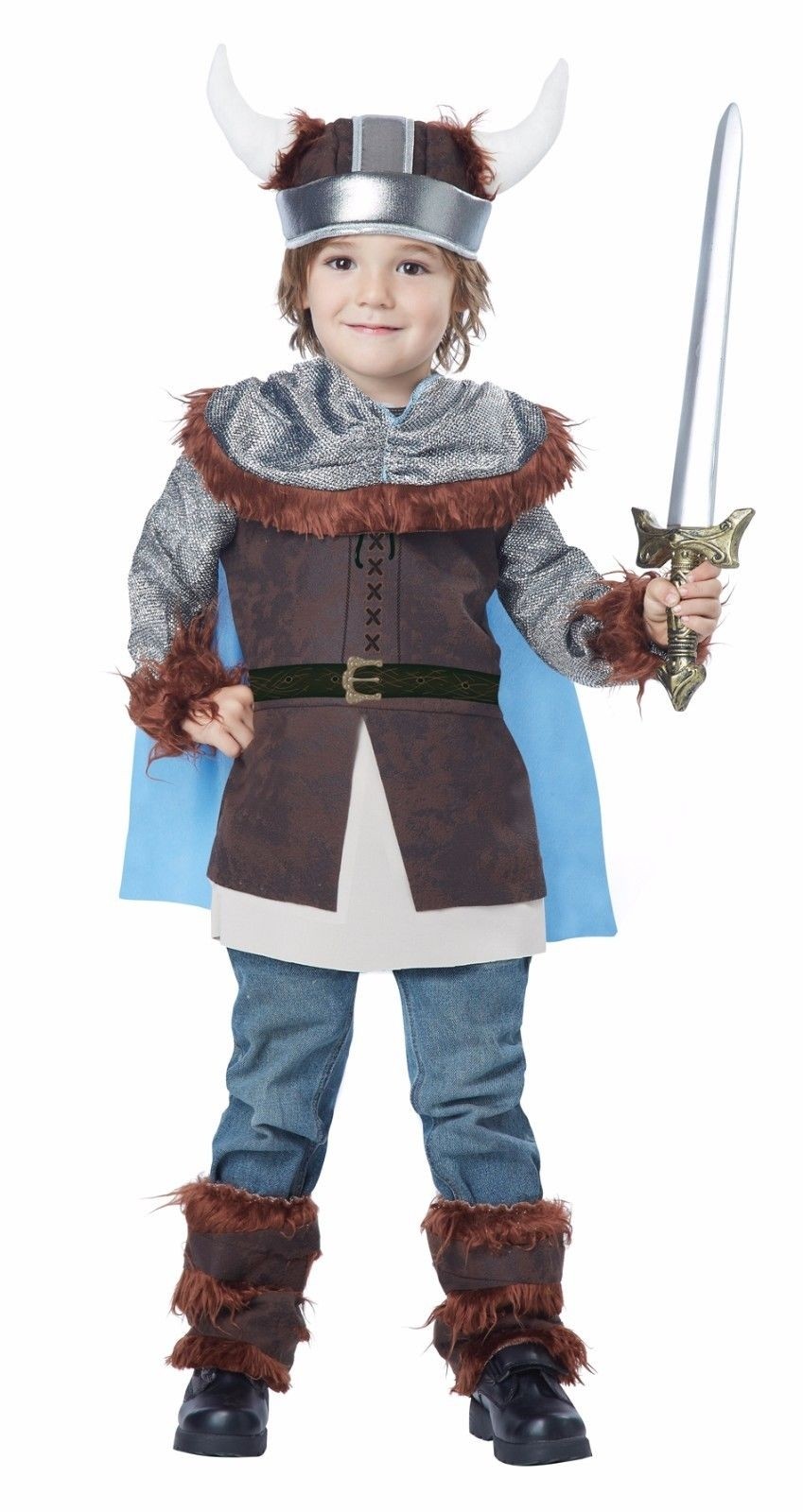 В комплект входит коричневая туника, плащ с плюшевым воротником с меховой отделкой и длинными рукавами. Шлем с серебряными вставками и белыми рогами и плюшевые накладки на обувь.