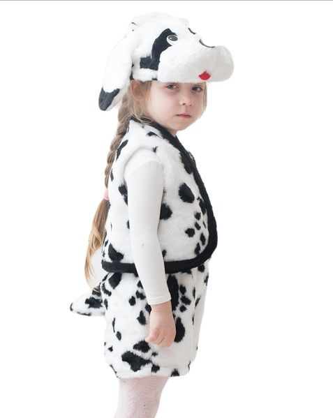 Костюм маленького Далматинца - это мягкий костюм, выполненный из плюшевого материала. В костюм входят шортики белого цвета с черными пятнышками и хвостиком, соответствующий жилет без застежек, а также шапочку-маску в виде мордочки собачки.