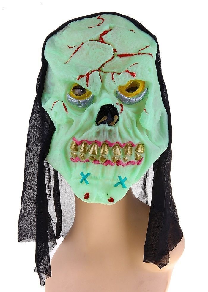 Пластиковая маска мертвеца зеленого цвета с кровью и черным волосами производит впечатление восставшего из ада мертвеца, который пришел в наш мир за новыми жертвами среди живых. Маска изготовлена из латекса и имеет размер 0,5х16х24