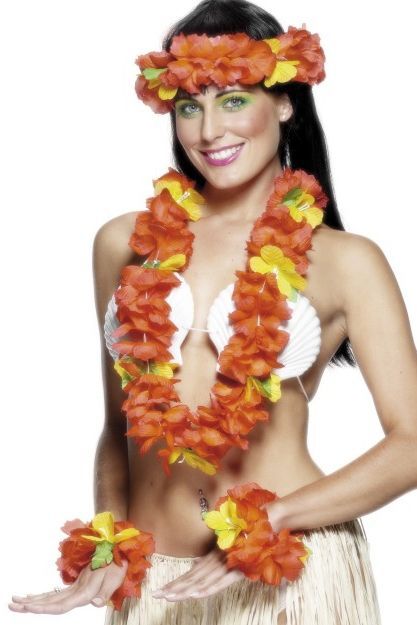 Красный гавайский набор включает в себя длинные бусы, два браслета и венок на голову. Набор выполнен в красном цвете с жёлтыми цветочками. Он прекрасно дополнит гавайские костюмы и подойдёт для пляжных вечеринок.