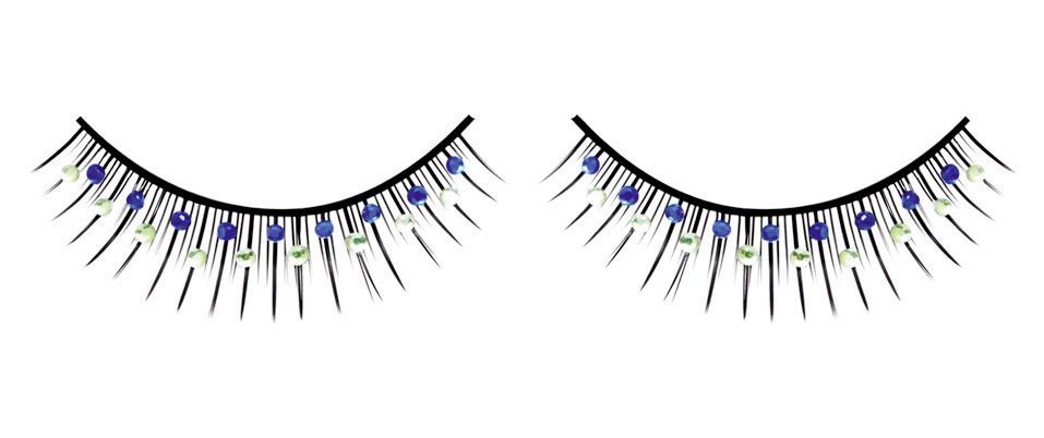 Милые накладные ресницы с сине-зелеными стразами в два ряда гармонично дополнят ваш образ, придав ему неповторимые черты.(Прочие аксессуары для дополнения образа вы также найдете в нашем каталоге).