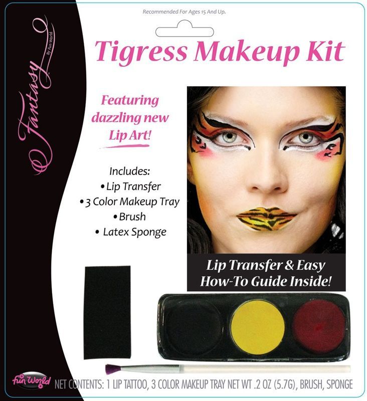В наборе "Макияж для тигра" имеется косметика в трёх цветах: в чёрном, оранжевом и бардовом. Также прилагается руководство по использования, губка и кисточка, которые будут весьма полезны при нанесении макияжа. Надев костюм тигра и нанеся тигровую текстуру на губы вы будете выглядеть весьма привлекательно и изящно.