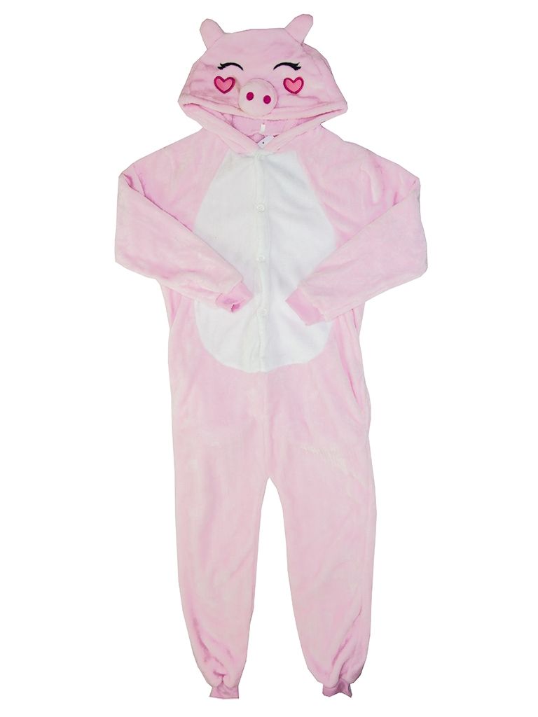 Детская пижама кигуруми Хрюшка светло-розового цвета выполнена из мягкого плюшевого материала. На грудке вставка белого цвета. Кигуруми с капюшоном в виде мордочки хрюшки с маленькими ушками, пяточком и розовыми сердечками на щечках.