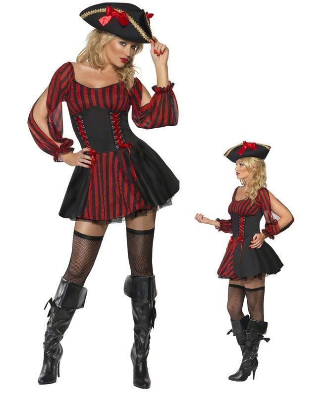 Костюм Буканьерки красавицы включает в себя короткое пышное платьице, выполненное в красно-черную полоску. Платье с длинными рукавами с разрезами и корсетом с боковыми шнуровками. Также в комплект входит черная пиратская шляпа с бантиками.