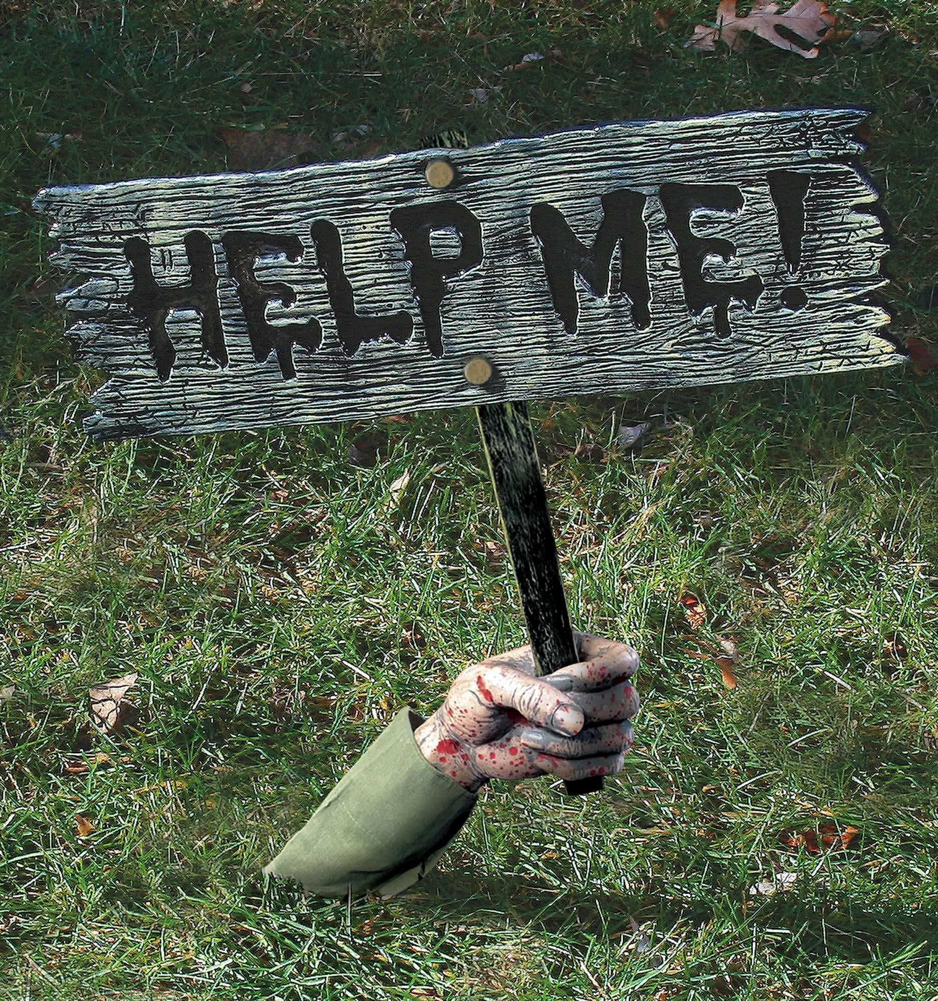 Табличка в руке Help Me - это хорошая декорация для сада или дома на Хэллоуин. Декорация представляет собой часть руки в зеленом рукаве которая держит деревянную табличку с черной надписью " Help Me", что в переводе с английского обозначает "Помоги мне".