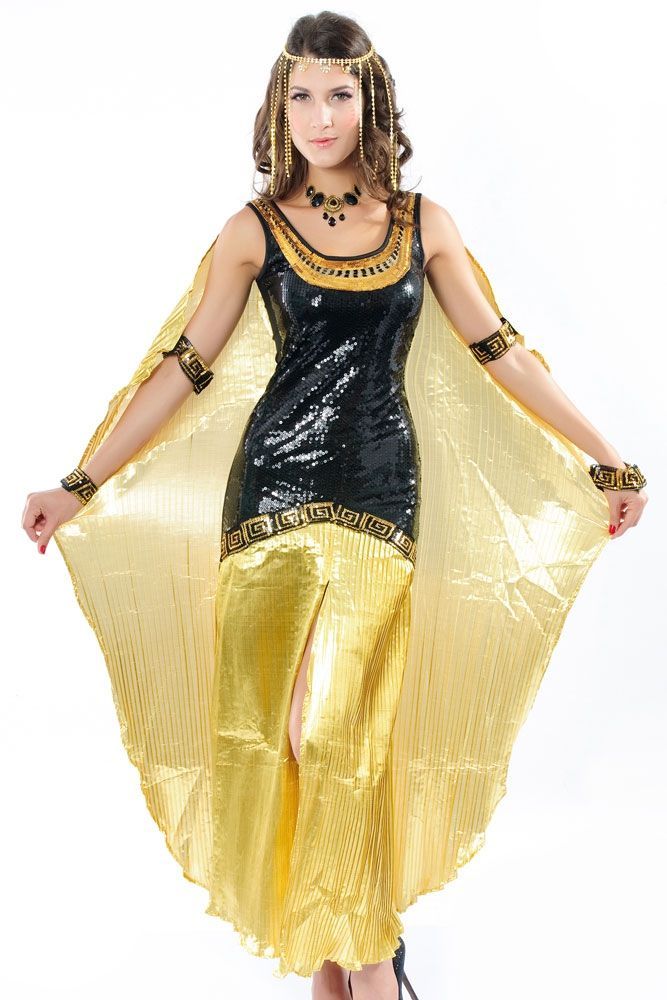 В костюм царицы Клеопатры входит платье с пришитой к нему накидкой и 4 повязки на руки. Материал: полиэстер.