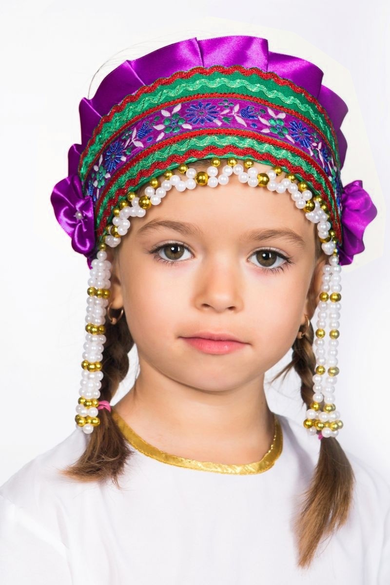 Фиолетовый кокошник Инна - детский атласный кокошник, выполненный в фиолетовом цвете и украшен разноцветной тесьмой и бусинками.