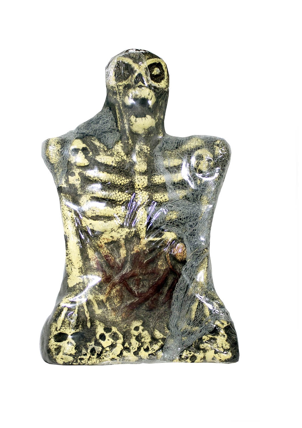Надгробие Скелет желтый выполнено из пенопласта, покрытого желтой и серой краской. Надгробие выполнено в виде торса скелета.