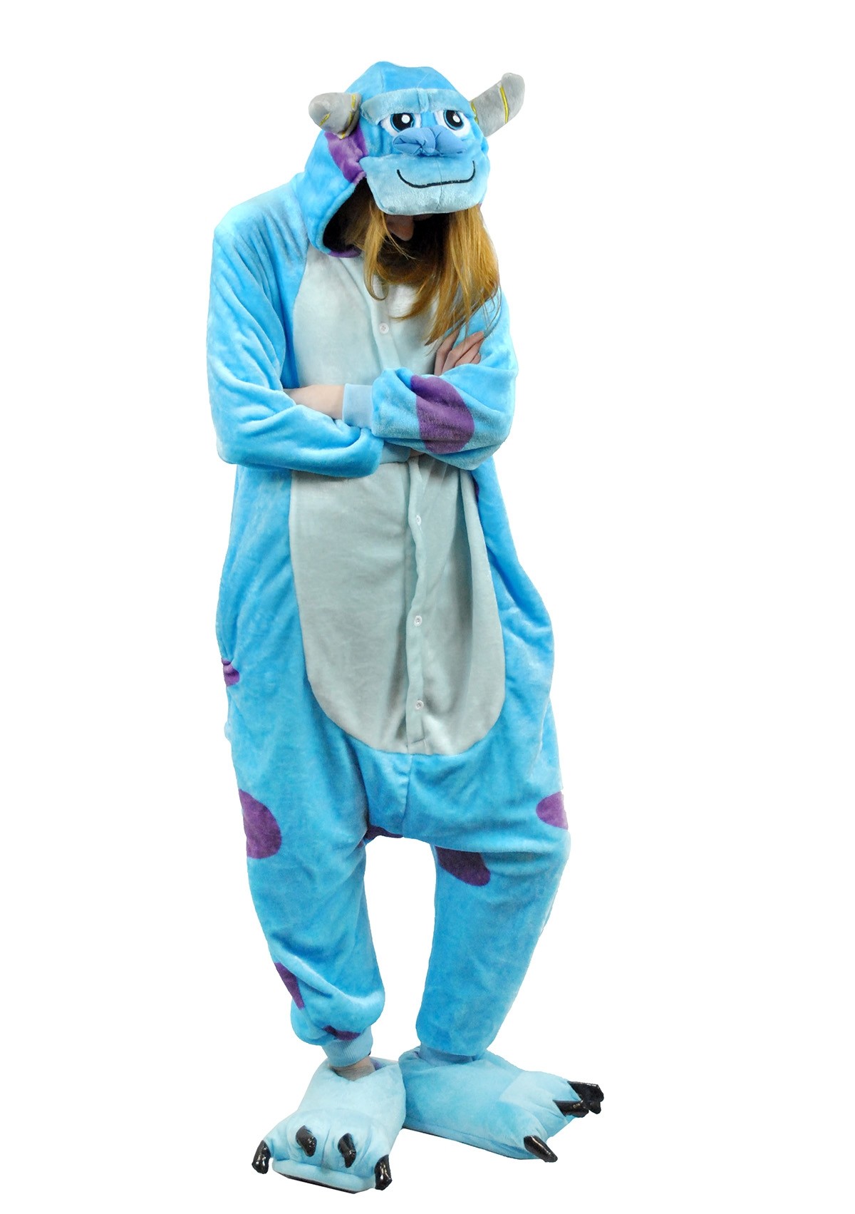 Кигуруми монстрика Салли представляет собой образ добродушного монстрика из мультфильма "Корпорация монстров". Кигуруми голубого цвета с фиолетовым крупным горохом. Капюшон выполнен в виде милой мордочки монстрика с рожками.