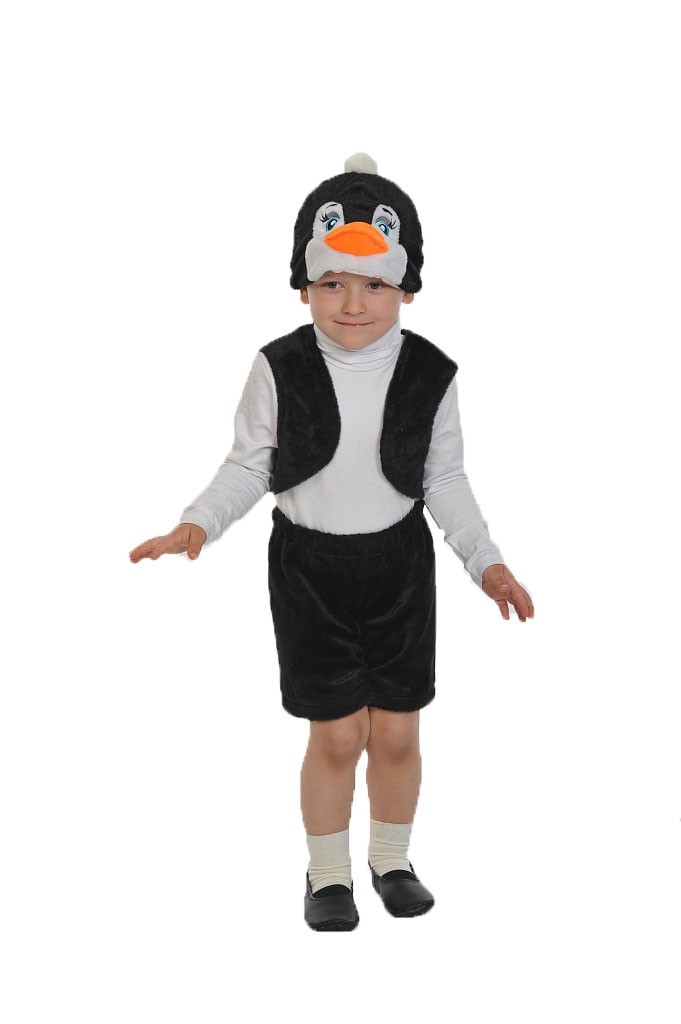 Костюм пингвинчика лайт выполнена из мягкого плюшевого материала и включает в себя черные шортики, черный жилет без застежки, а также шапочку-маску, выполненную в виде головы пингвина.