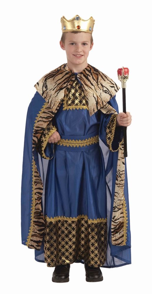 Синий костюм короля - это детский костюм, который идеально подойдет для новогодних праздников и утренников. Костюм включает в себя длинное синее одеяние с черно-золотой отделкой и широкими рукавами, пояс, а также плащ, который завязывается на шее. Плащ имеет тигровые вставки. Корона в комплект не входит, но ее можно приобрести отдельно, а также другие королевские аксессуары.