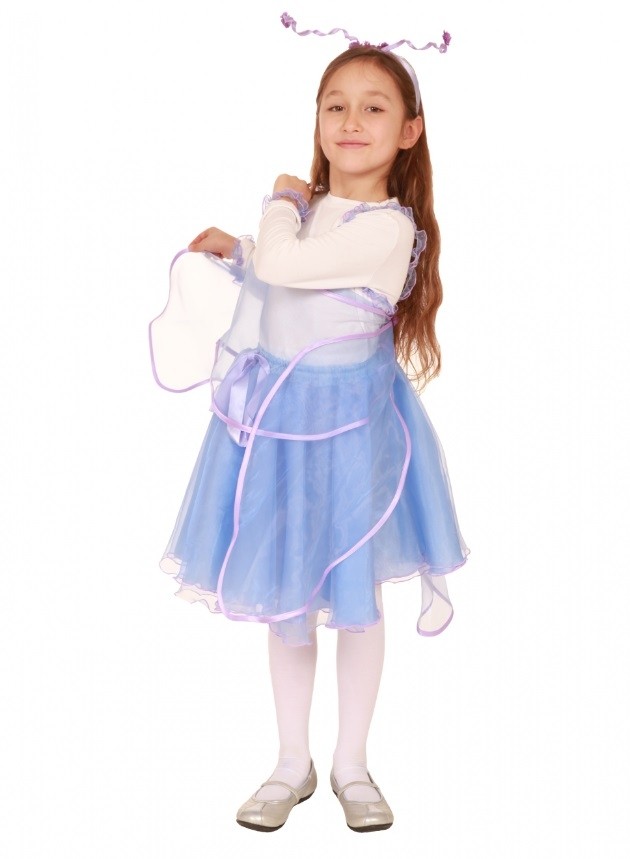 Детский костюм бабочки - легкий изящный костюм, который включает в себя пышную голубую юбочку с розовой отделкой и атласной лентой, легкие сетчатые крылышки, а также костюм дополняет тонкий ободок со спиральными рожками.