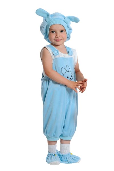 В комплект костюма голубенького кролика входит комбинезон, пинетки и берет с ушками.