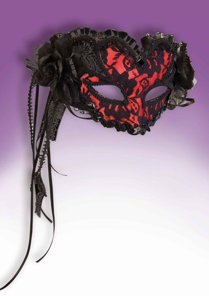 Красная ажурная венецианская маска - это изящная маска придаст вам на карнавале загадочный вид. Маска выполнена в красном цвете и сверху украшена черным кружевом, а также объемными цветами и ленточками.