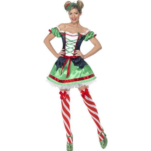 Костюм принцессы Холли - это милое атласное платье, которое сочетает в себе зеленый, красный, белый и черный цвета. На груди имеется зеленая шнуровка. Рукава фонарики. Плечи открыты, что придает наряду больше изящества. Чулки в комплект не входят.