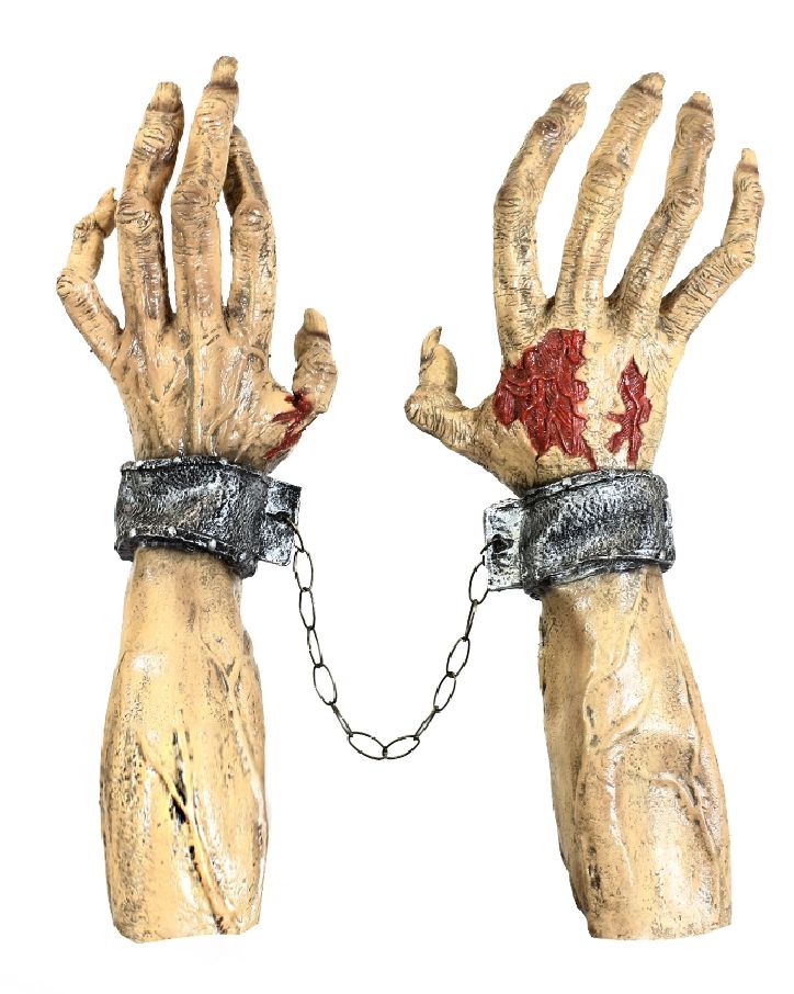 Гигантские руки в длину около 70 см. Руки выполнены из латексного материала бежевого цвета. К рукам прикреплены наручники серебряного цвета.