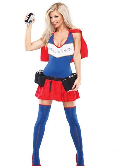 Костюм рефрешинатора выполнен в красно-синих цветах. В комплекте костюма имеется платье с прикреплённым красным плащом, соответствующие шортики, синие чулки и пояс с отделениями для шести банок пива. Этот костюм сможет порадовать многих. В нём вы можете пойти на пивной фестиваль или вечеринку, а также в клуб и на подобные мероприятия.