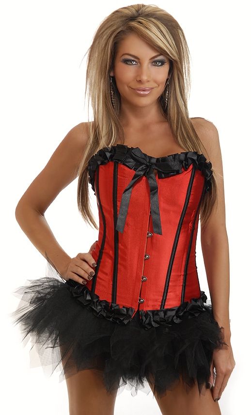 Атласный алый корсет с юбкой, без бретелек, на шнуровке сзади и застежками спереди.