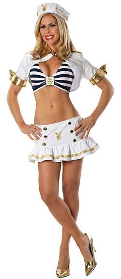 Костюм морячки Playboy включает в себя короткий полосатый топ сине-белого цвета, который по середине украшен бляшкой с якорем, короткую слегка расклешенную юбочку с декоративными пуговицами и изображением кролика, а также морскую шапочку с изображением логотипа Playboy и белое балеро с короткими рукавами и золотыми манжетами.
