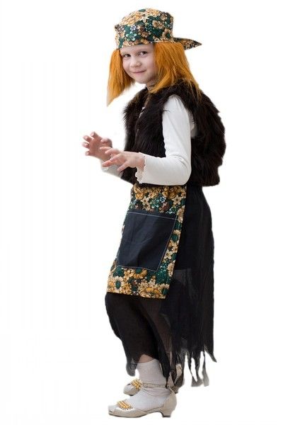 Детский костюм Бабы Яги идеален для детских русских спектаклей. Костюм включает в себя цветастую косынку с рыжими волосами, меховую жилетку, набивной горб, а также длинную черную юбку с цветастым передником.