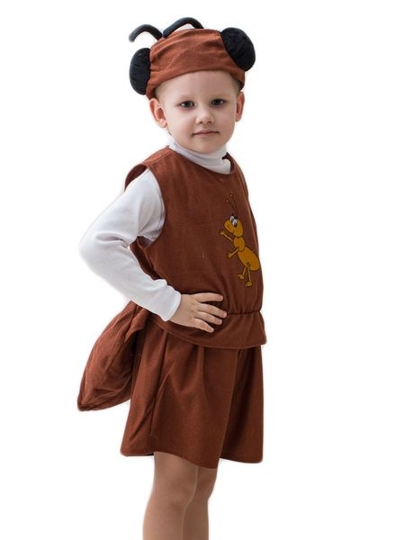 Детский костюм муравья выполнен в коричневом цвете. В комплект входят шортики, безрукавка с хвостиком муравья и изображением муравья спереди. Завершает образ маска-шапочка с черными глазами и усиками муравья.