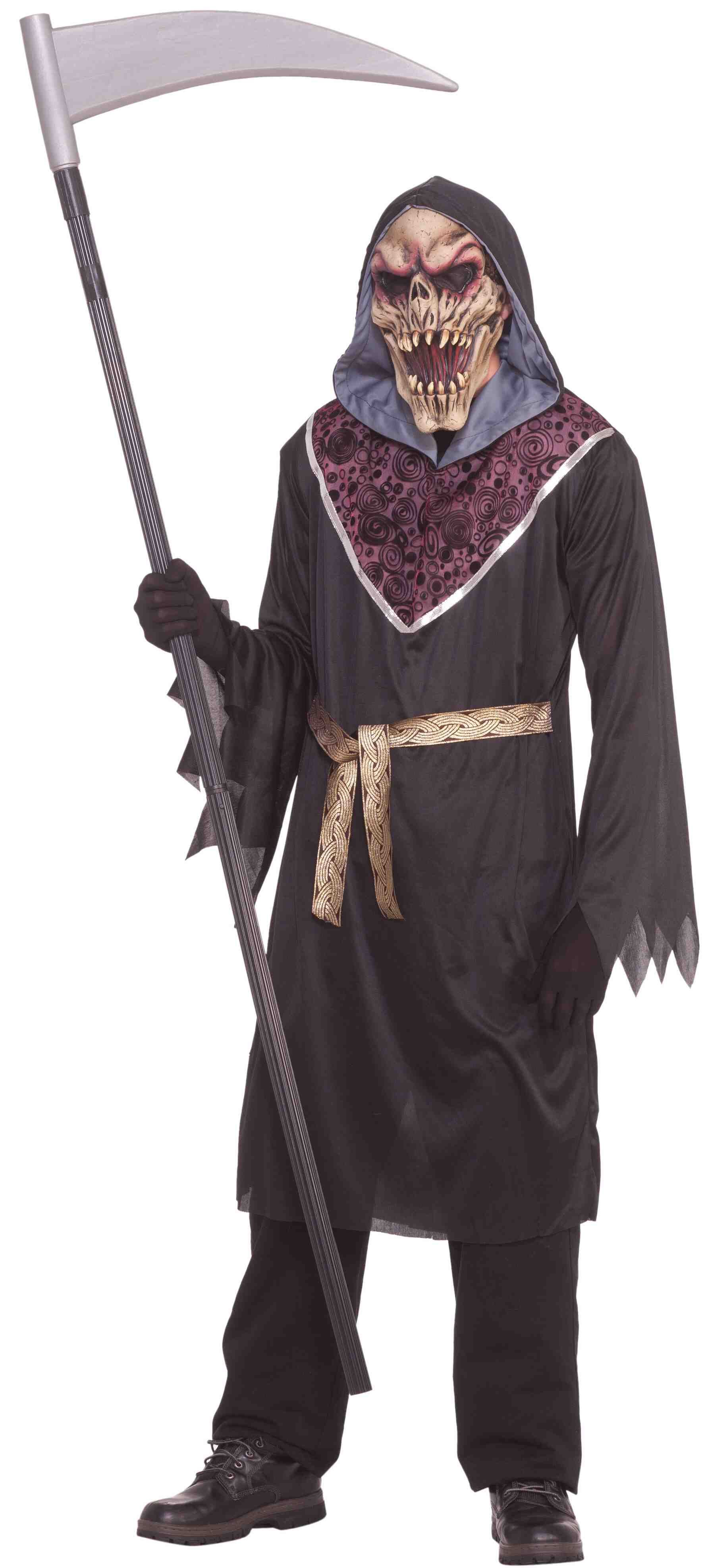 Костюм смертоносного зомби включает в себя маску, робу, пояс. Коса в комплект не входит. Такой костюм станет идеальным для вечеринки в честь Хэллоуина, Пятницы 13 и других подобных мероприятий.