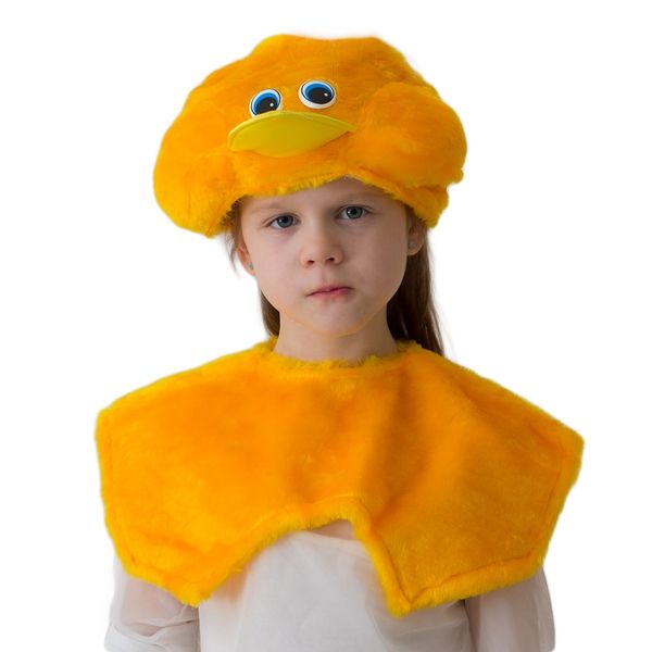 Комплект цыпленка эконом - яркий желтый меховой комплект, в который входит накидка на липучке, которая одевается на плечи, а также маска цыпленка, сделанная в виде шапки с глазками и желтым клювом.