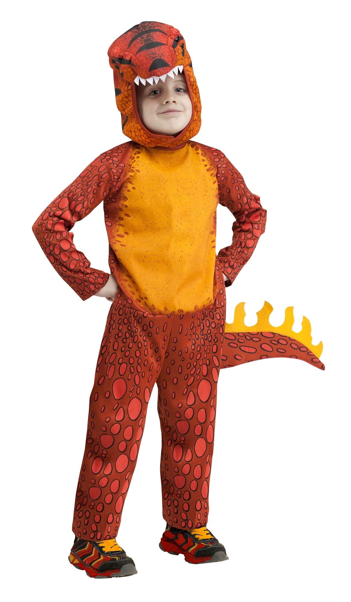 Костюм огненного динозавра Раптора - ярко-рыжий костюм, который включает в себя комбинезон с пришитым хвостом, капюшон в виде головы динозавра и реалистичные глаза на капюшон.