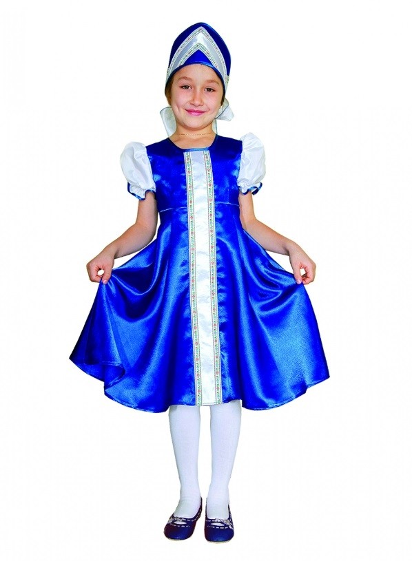 Синий костюм Царевны включает в себя атласное платье синего цвета с белой полосой с узорами и белыми рукавами-фонариками. Платье дополняет синий атласный кокошник, который также украшен белой узорчатой вставкой.