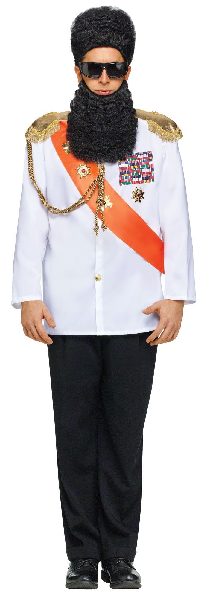 Костюм генерала Аладина из кф Диктатор - белый торжественный мундир представляет собой белоснежный пиджак с золотистыми эполетам, красной лентой через плечо с орденами и различными значками.