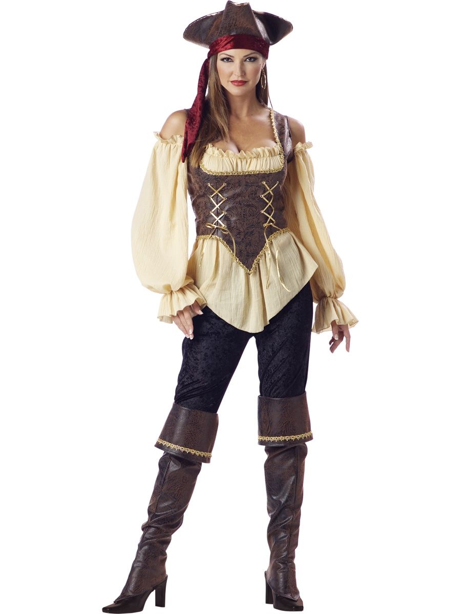 Костюм пиратки женский состоит из песочного цвета блузки с открытыми плечами, корсета, черных брюк, банданы, пиратской шляпы и специальных накладок на обувь, имитирующие сапоги с высокими голенищами. Стильный костюм пиратки станет прекрасным нарядом для маскарада или тематической вечеринки.