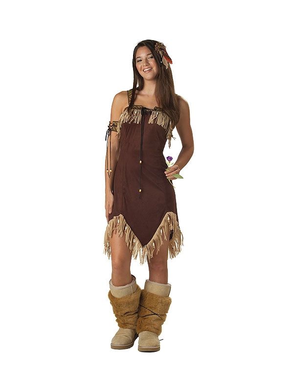 Подростковый костюм индейской принцессы выполнен в коричневом цвете. В этом костюме вы будете самой красивой девушкой своего народа! Костюм состоит из платье с отделкой из бахромы, нарукавных повязок, украшения для волос и меховых коричневых накладок на обувь.