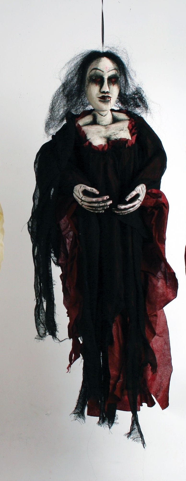 Подвесная фигура женщины-вампира со светящимися глазами 90 см в подходит для украшения зданий как снаружи так и внутри. Женщина-вампир - в черном платье, с черными волосами, красными глазами и окровавленными губами. Высота фигуры с расправленной окантовкой - 90 см. Батарейки входят в комплект.