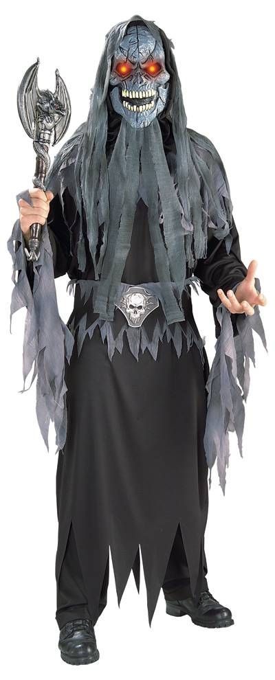 В костюм скелета с горящими глазами входит: одеяние с драпировкой и капюшоном, пояс, маска, батарейки для глаз.