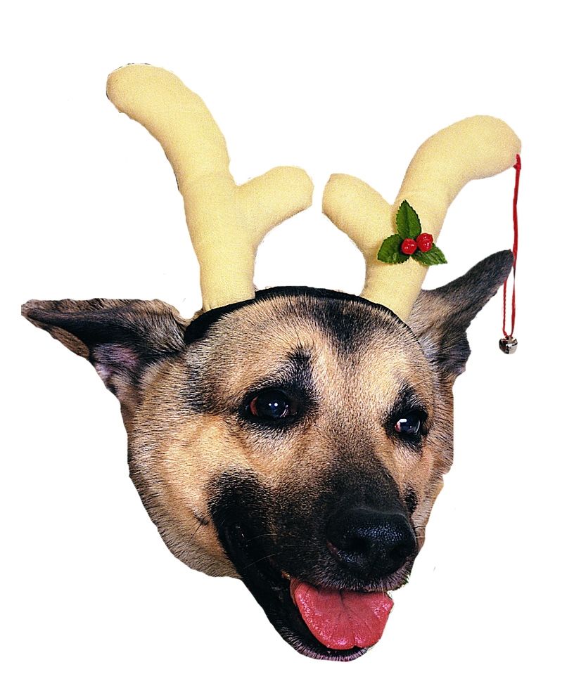 Головной убор для собаки представляет собой оленьи рога из мягкого материала в светлых тонах. На одном из них имеется украшение из двух ягодок и трех листочков, а также прикреплен маленький бубенчик. Головной убор хорошо держится и не спадает.