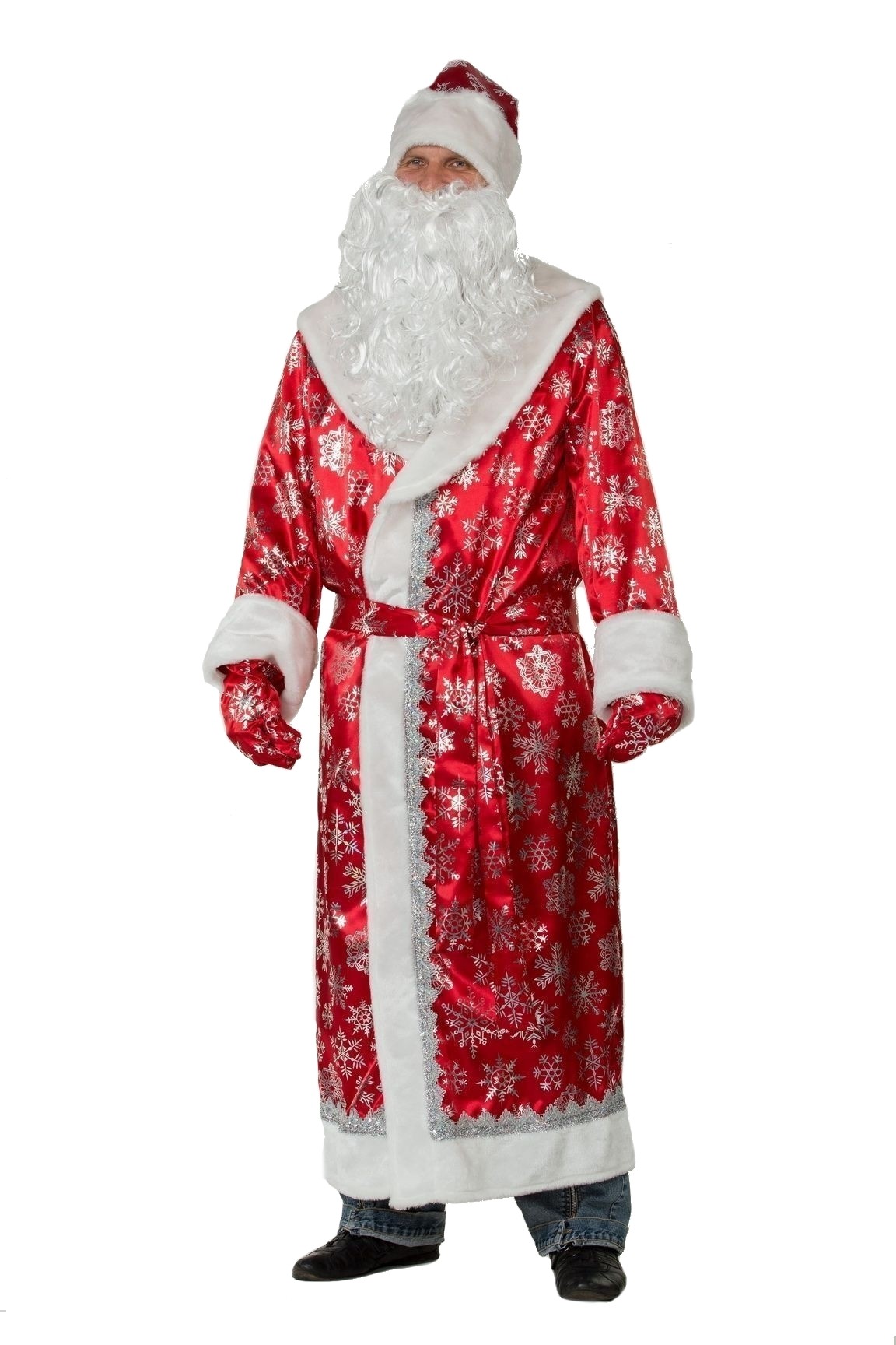Сатиновый красный костюм Деда Мороза - это костюм для взрослых, который идеально подойдет для выступления на детских новогодних утренниках и подобных мероприятиях. Костюм состоит из длинной шубы красного цвета с белой отделкой и блестящими узорами, к ней прилагается красный пояс. В костюме также имеется шапка, варежки, белая кудрявая борода, а также мешок для подарков.
