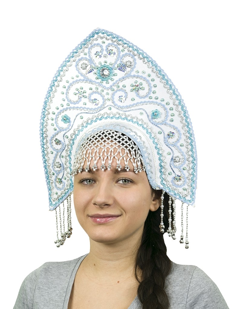 Кокошник фиксируется на голове при помощи эластичной резинки и тонких ленточек.