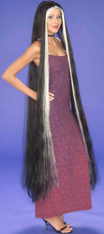 Парик леди Годивы прекрасно подойдёт к вечерним платьям и другим нарядам. Парик леди Годивы выполнен в виде длинных шикарных волос, которые окрашены в чёрный цвет, а передние пряди в белый.