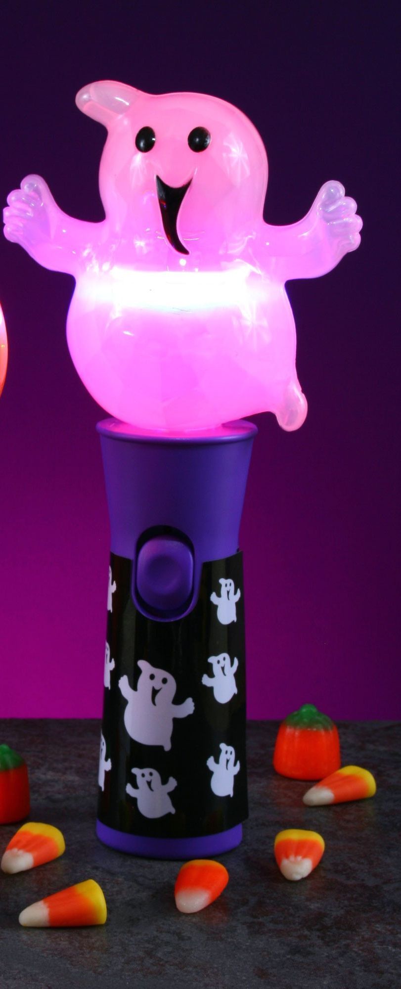 Радужный фонарик Привидение представляет собой светящееся различными цветами розовое привидение. Рукоятка у фонарика выполнена в черно-фиолетовом цвете. На ней изображены белые привидения.
