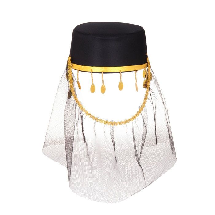 Восточный головной убор представляет собой маленькую черную шляпку, украшенную золотистыми монетками и вуалью на пол лица. Идеально дополнит костюмы восточных красавиц и наряды для танцев живота.