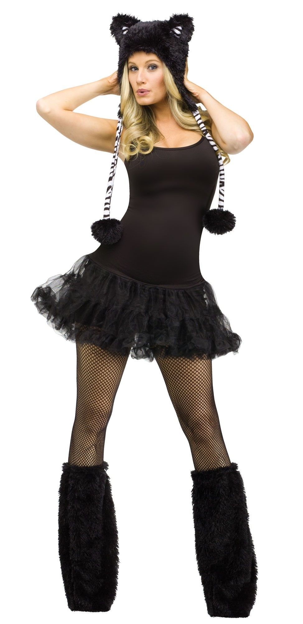 Набор плюшевого Белого тигра состоит из мягкого капюшона с ушками и веревочками с помпонами. Ушки и веревочки выполнены в бело-черную полоску. В набор также входят высокие черные накладки на сапоги из теплого плюшевого материала.