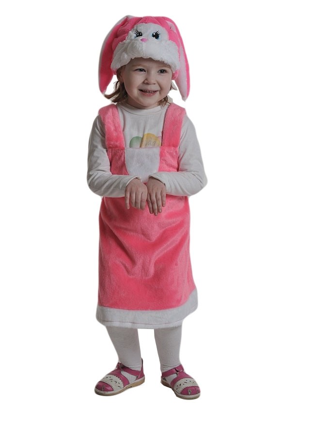 Розовый плюшевый костюм Зайки - мягкий костюм для девочек, выполненный из плюшевого материала розового цвета. В комплект входит платье с белым подолом, а также маска-шапочка в виде мордочки зайки с ушками.